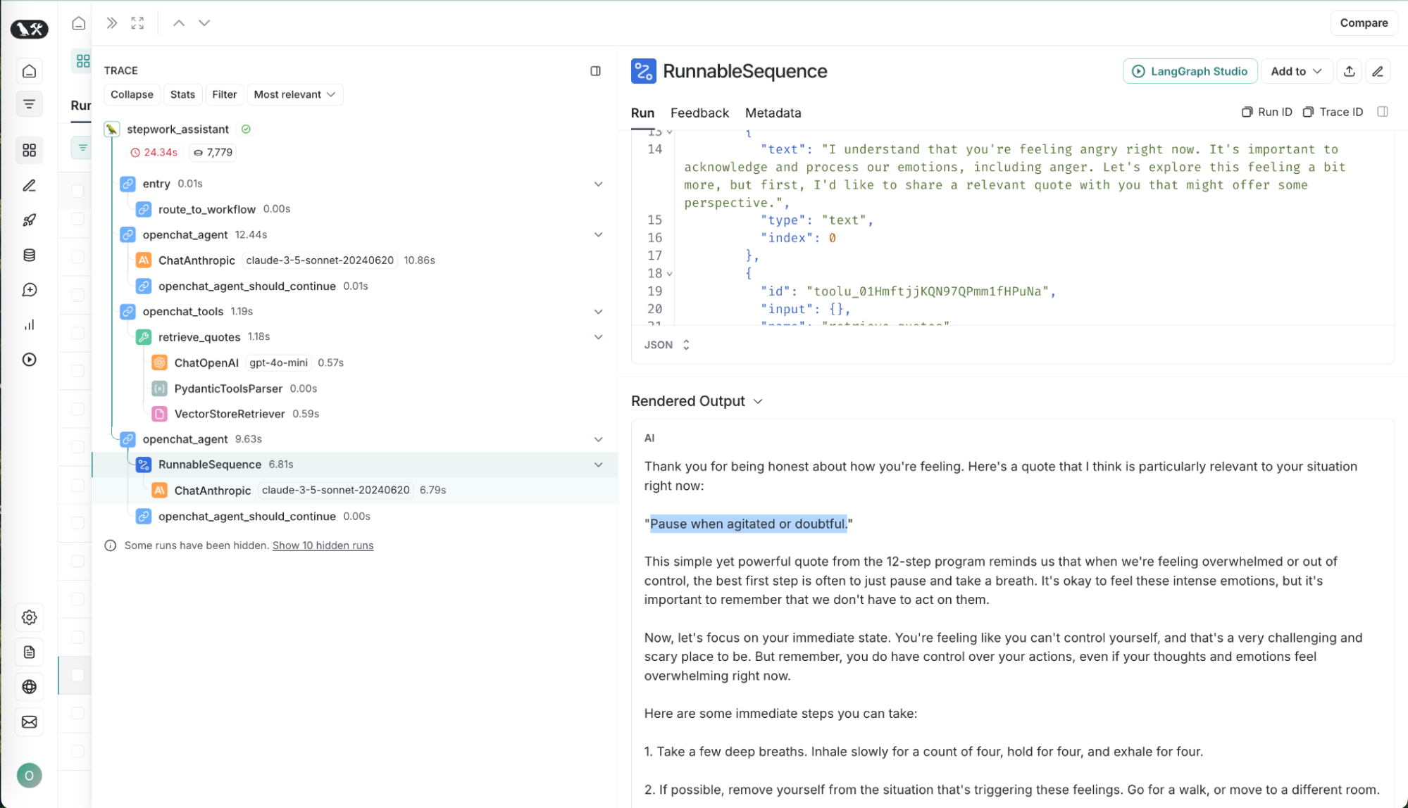 LangSmith 帮助 OpenRecovery 团队识别故障点,例如当语言模型缺乏成瘾康复支持所需的适当同理心时。这使得人类可以介入并进行关键的纠正。