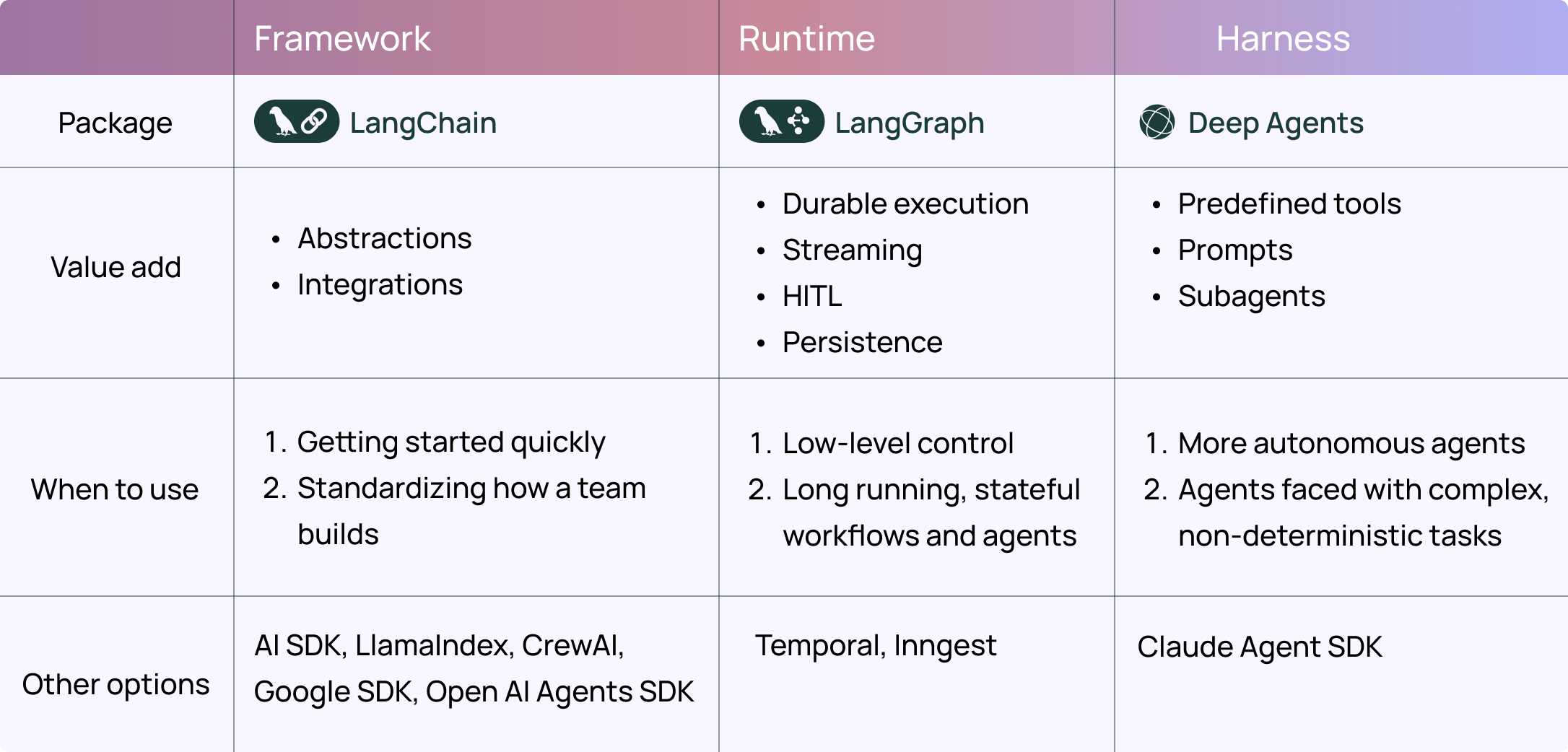 它们是互相构建的——deepagents 构建在 langchain 的智能体抽象之上,而 langchain 又构建在 langgraph 的智能体运行时之上。