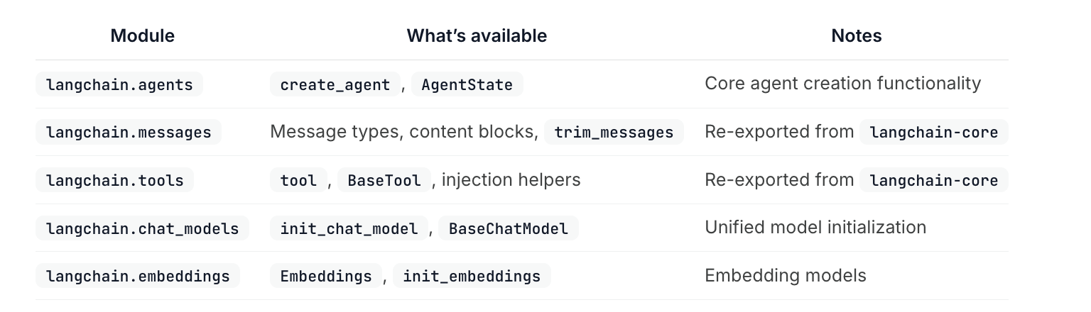 LangChain 1.0 将包范围缩小到基本抽象。旧功能移至 langchain-classic 以实现向后兼容。随着框架的成熟,我们了解了哪些模式最为重要。这个精简的包去除了多年积累的功能,使 LangChain 既简单又强大。