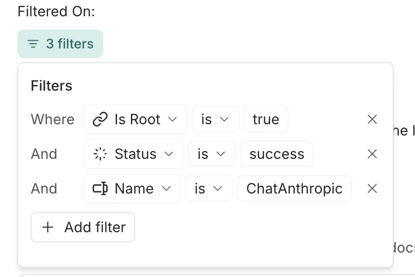 对于每个警报指标,您可以利用一组强大的过滤器来专注于特定子集的运行(例如,按模型、工具调用或运行类型进行过滤)。