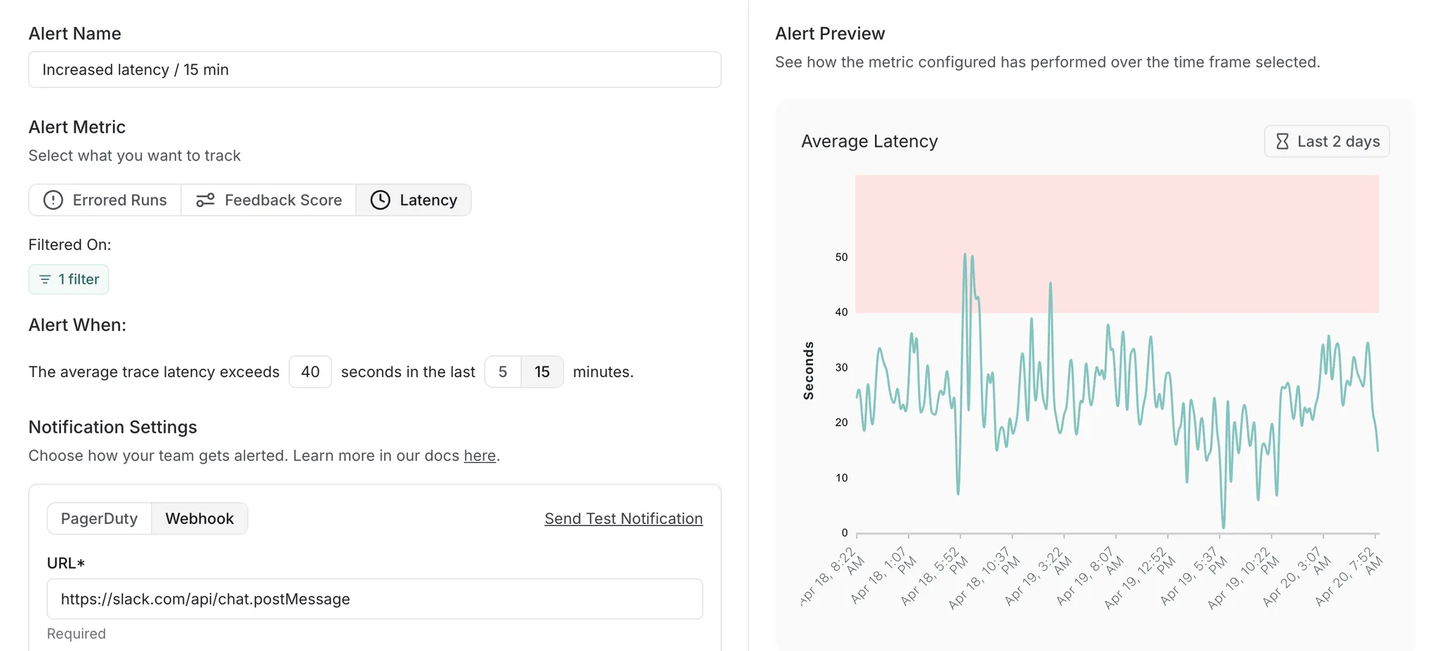 最后一步是将警报集成到您现有的工作流程中。我们支持通过 PagerDuty 发送警报,或设置自定义 webhook(例如,将通知直接发送到 Slack 频道)。