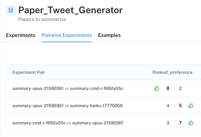 在 UI 中,我们将在数据集的“成对实验”选项卡中看到所有成对评估的结果。重要的是,我们看到成对评估显示了对某些 LLM 明显优于其他 LLM 的偏好——这与单独的标准评估形成对比,后者显示出很少的区分度。