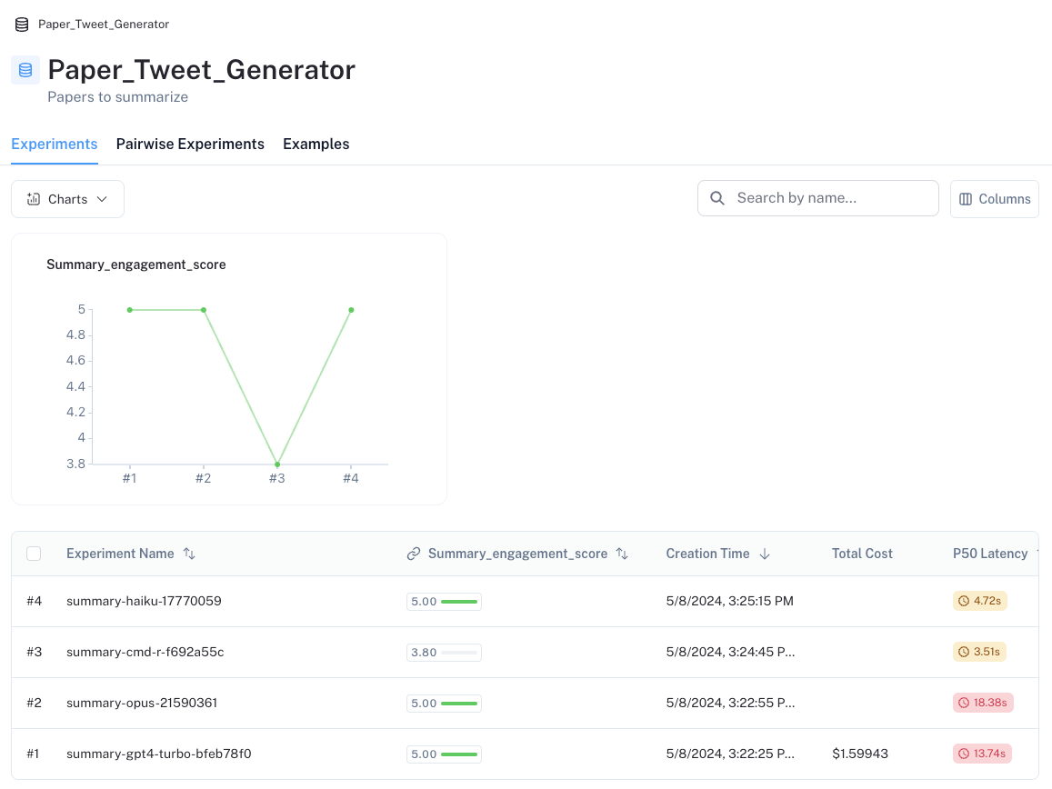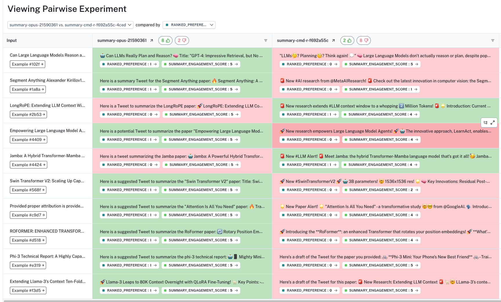 为了激发此功能,此视频 展示了与内容生成相关的常见用例。在此示例中,我们希望 LLM 生成引人入胜的推文来总结学术论文。我们构建了一个包含 10 篇不同论文的数据集作为示例(此处),并从 4 个不同的 LLM 生成了摘要。